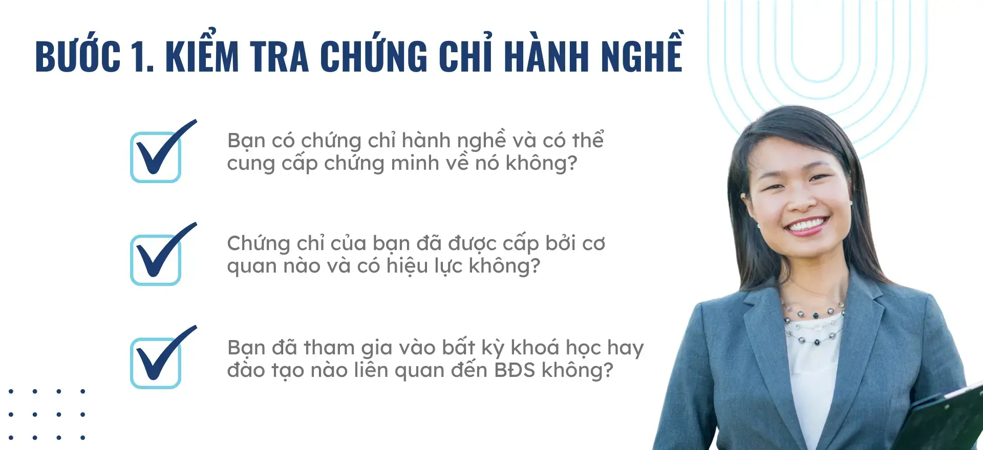 Môi giới bất động sản phải có chứng chỉ hành nghề theo quy định của Luật Kinh doanh Bất động sản. Bạn có thể hỏi môi giới về chứng chỉ của họ và kiểm tra xem nó có hiệu lực và đúng quy định không. Điều này đảm bảo rằng họ đã qua quá trình đào tạo và có kiến thức cần thiết về lĩnh vực này.
