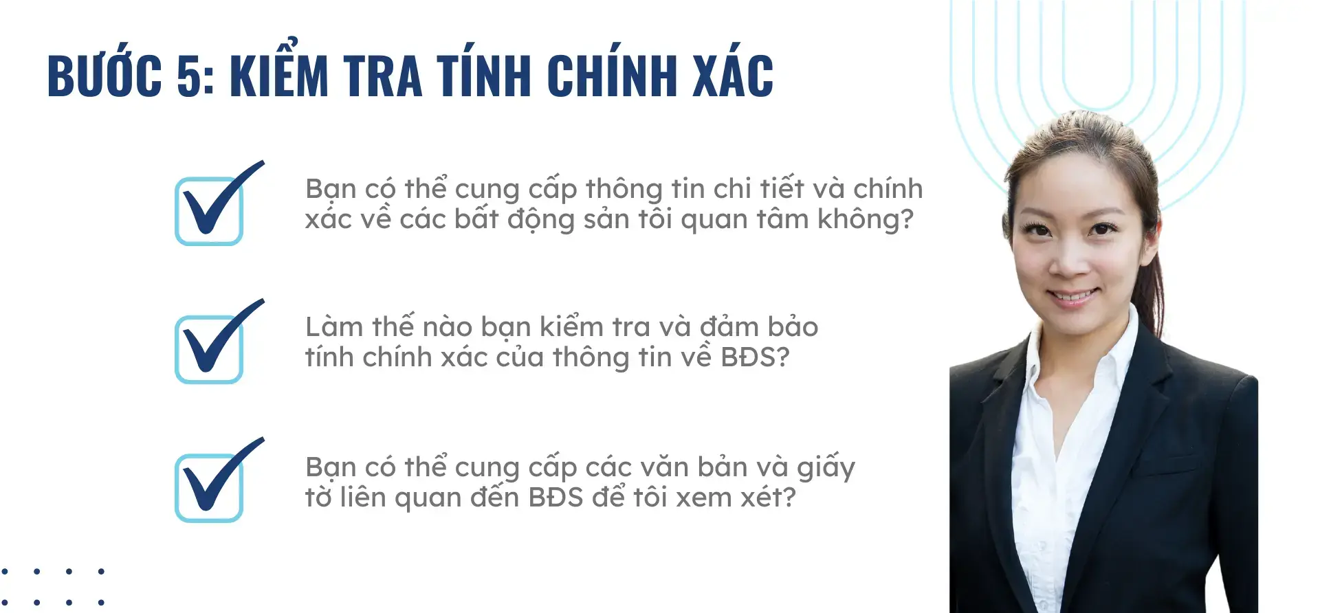 Mua bất động sản đòi hỏi sự chính xác trong thông tin. Đặt câu hỏi về thông tin liên quan đến bất động sản bạn quan tâm để kiểm tra tính chính xác và sự trung thực của môi giới. Hỏi về các chi tiết quan trọng như diện tích, giá bán, tình trạng pháp lý, và bất kỳ thông tin quan trọng nào khác.