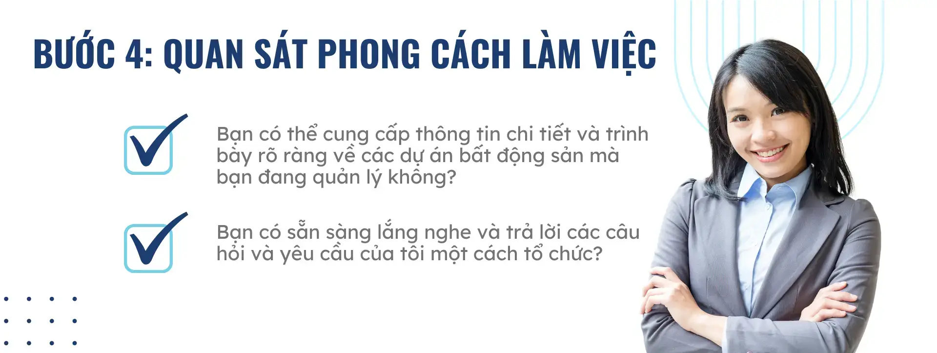 Phong cách làm việc của môi giới có thể ảnh hưởng lớn đến trải nghiệm của bạn. Quan sát cách họ tương tác với bạn, phong cách giao tiếp và mức độ am hiểu về thông tin dự án bất động sản. Môi giới nên có phong cách giao tiếp chuyên nghiệp và không nên áp đặt hay thúc giục bạn đưa ra quyết định nhanh chóng. Một môi giới xuất sắc luôn sẵn sàng cung cấp thông tin và hỗ trợ bạn khi bạn cần.